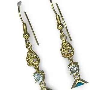 Elegant gold and blue teardrop earrings with intricate detailing.