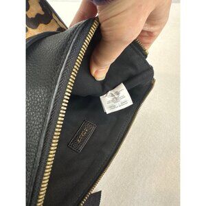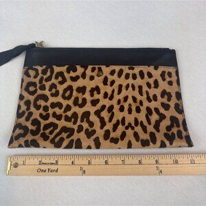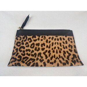 J Crew Black Leather Calf Hair Leopard Print Clutch Brass Accents Zipper