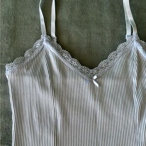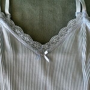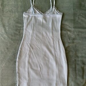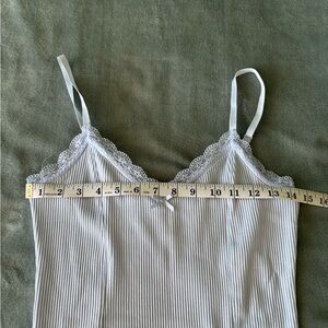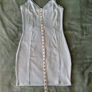 Light blue bodycon dress with lace accents. Features adjustable straps.