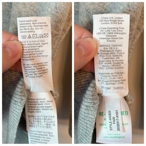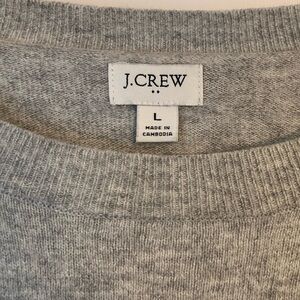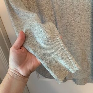 Size large. Color is Heather dove. Slightly loose fit. Hits slightly below hip. Crew neck. Long sleeves. Ribbed cuffs. Curved hem with rib detail. Some signs of wear such as minor pilling. 45% cotton, 35% merino wool and 20% polyamide. Smoke-free home.
