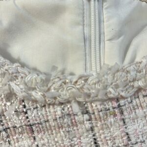 New without tags. SHE Limited tweed textured sleeveless dress features a classic box design with a bit of metallic thread and pink hue in a sophisticated cream color. Dress has 2 faux pockets in the front with a silver button each. Perfect for any occasion, it offers a timeless look with a modern twist. Size M. Fully lined, dress zipper in the back. Pit to pit measures 16”, and length measures 31”.