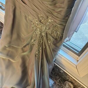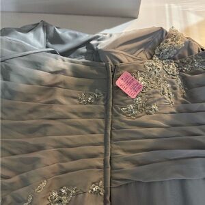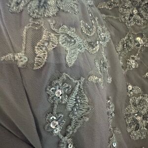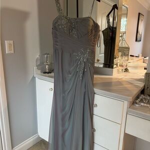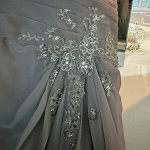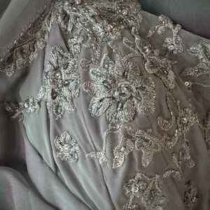 This elegant gray evening gown features intricate detailing and a sophisticated design, perfect for special occasions.