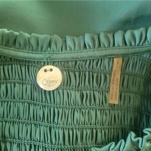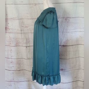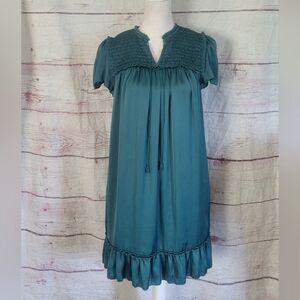 Rich teal color short sleeve dress with smocked detail and tassels. Ruffle detail at the hem. In excellent condition.