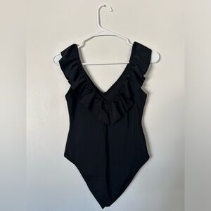 This is a thong-cut bodysuit with a ruffled double V-neckline.