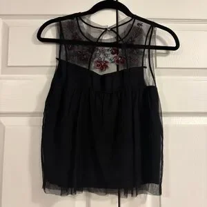 Chic black sleeveless top. Features colorful floral embroidery. Ideal for casual outings. Perfect condition