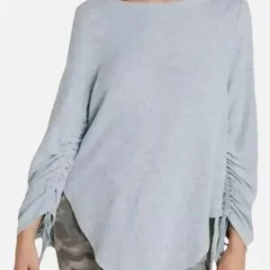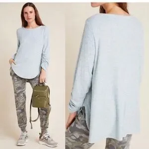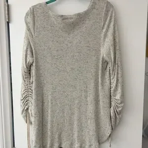 Anthropologie Saturday Sunday Tenley Tunic with ruched sleeves will elevate your wardrobe in a flecked polyester blend. Back is ribbed. Hi-lo rounded hem. Oversized for comfort and style. Measures 21” PTP. Size Medium. VGUC