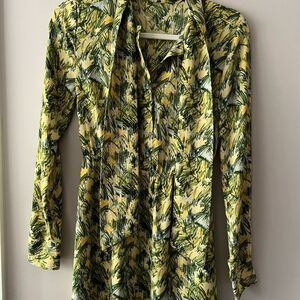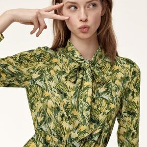 Step into casual elegance with the Sunday Best Green and Yellow Wrap Sundress. This dress features a vibrant botanical print in lush green and sunny yellow hues, perfect for work or a relaxed day out. Designed with a tie front and long cuffed sleeves, it offers a flattering silhouette with a collared neckline for a touch of sophistication.