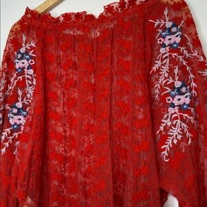 Free People red jubilee floral embroidered sheer peasant top size small