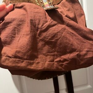 Stylish brown suede backpack. Features decorative bead detailing. Adjustable straps for comfort.