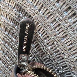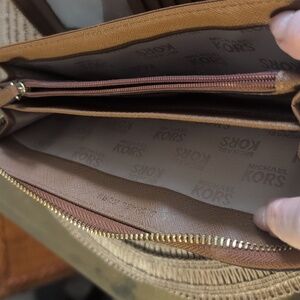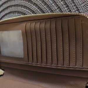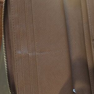 Great looking chocolate brown pebble leather wristlet w detachable strap, multiple interior pockets,id window,card slots , gold features, 7/14" x 4"H , strap 6" long, in great condition except for 1 area that has a faint ink line that the last picture shows, I'm up close and it doesn't show that way in person, except for that it's great