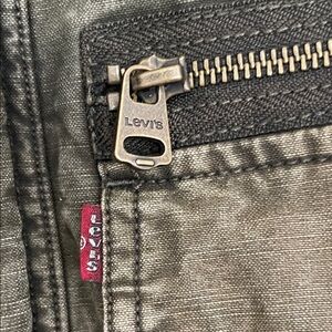 Classic Levi's heavy coat in olive. Features 5 pockets on the front and one inside. Rugged design. Ideal for outdoor adventures. The outside is canvas and the inside is a like the inside of a thick sweatshirt. The inside is pilly and does show wear. The outside is a little distressed around the cuffs and does have a few stains that I have not tried to remove. Please see all photos.