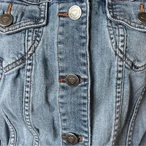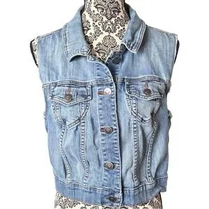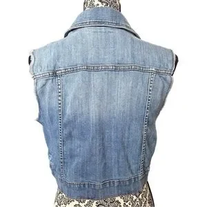 Stylish blue denim vest by Torrid. Features button closure and front pockets. Raw edge arm opening