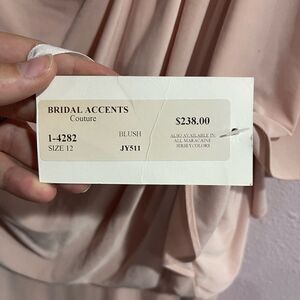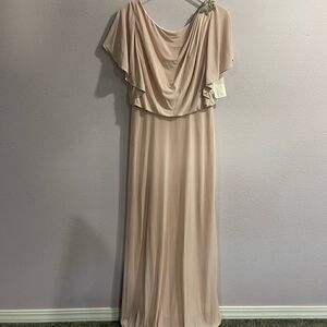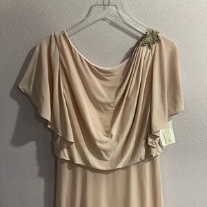 Blush pink cream coloring. Style JY511. Embellished gem accent. Low v back. Jersey like comfy material. Tags still attached. Excellent condition. Model picture of the back is same dress just different color