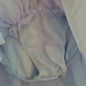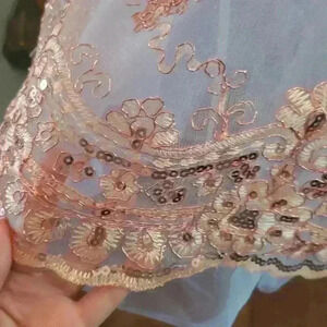 Pointed cami with straps, center front and center back pinch, lace applique at neckline, 1 layer rose gold lace topskirt with scallop hem, layer tricot underskirt, and attached trunks.