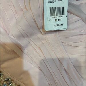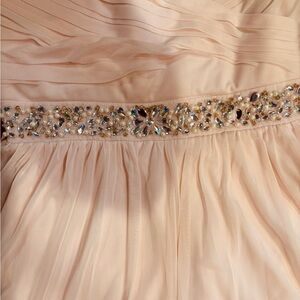 BEAUTIFUL, CLASSY, CLASSIC & Elegant! Soft pink chic long halter dress with chiffon detail! With crystal & pearl sparkling pleated bodice waist detailing! Waist with bow to pull in waist! 35”L. Armpit to armpit is 18”. Girl SIZE 16.5 plus by Speechless. Back zipper detail. BRAND NEW with Tag!