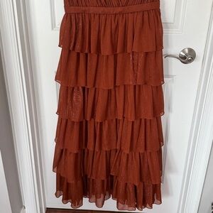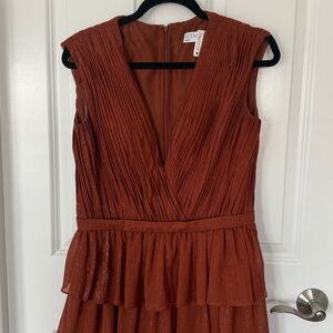 Chic sleeveless maxi dress with a tiered design. One tier has been removed. Rich rust color, gold sparkles throughout. Plunging V. The dress has been taken up in the shoulders. Worn once for an event, but needs a dry clean. In great condition.
