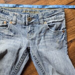These are a really nice pair of preowned denim jeans. As you can see above, they are in preowned shape with minimal preowned ware. The hems have started to break through, as you can seee above. They still have a great look and great color. As for the stretch, there is no stretch to them.