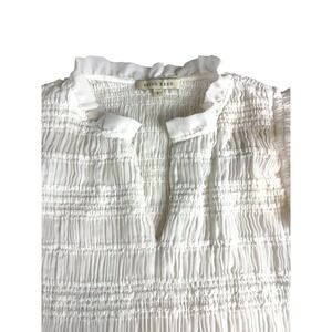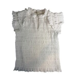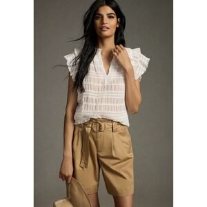 Anthropologie Sarah Hann Sheer Ruffle Shirred Top Blouse White Short Sleeve Sz L