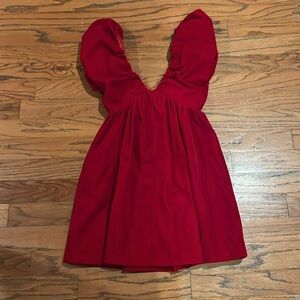 Chic red mini dress with flutter sleeves. Perfect for festive occasions.