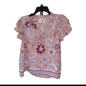 Like new short flutter sleeve top with a ruffled neck, tie closure and a high low hem.