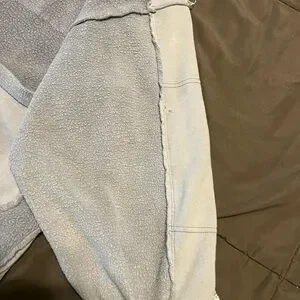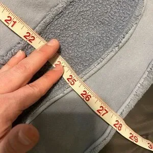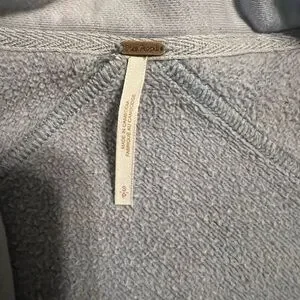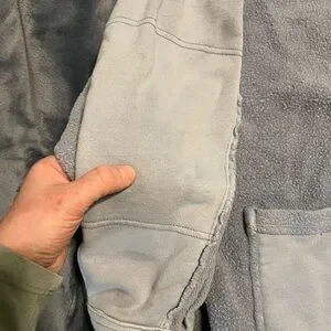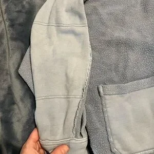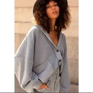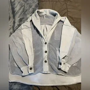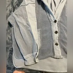 Cozy oversized jacket. Button closure. Large front pockets. Perfect for layering. Small hardly noticeable spot on right sleeve (pointed out in 7th photo where my thumb is). Tiny pinhole on left sleeve (8th and 9th photo). Looks purposeful but isn’t. Ptp-27in length front-25.5in- back-28in
