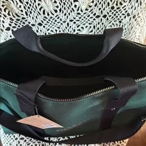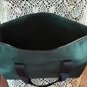 Elegant Coach duffel bag. Green body with black accents. Unisex, Ideal for travel or gym.