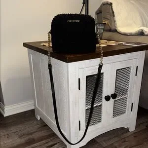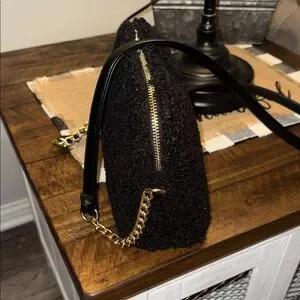 Chic black crossbody bag with textured finish. Features a stylish chain and leather strap. Perfect for versatile wear.