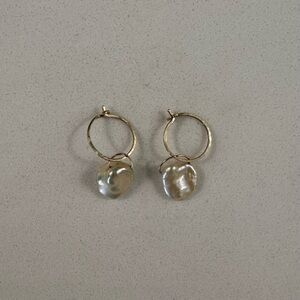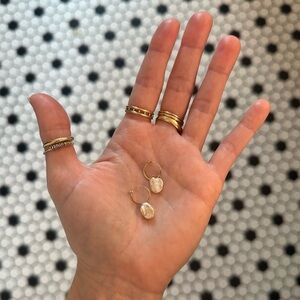 Pair of Catbird Hoop Dream Gold Earrings (the smaller version no longer sold) and Mermaid's Treasure pearl charms. Hoops are lightly textured for extra sparkle, and host an ultra-secure and simple closure. Made with 100% recycled solid 14k yellow gold. Pearl are organic shaped and slightly different.