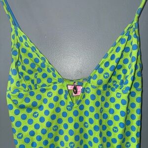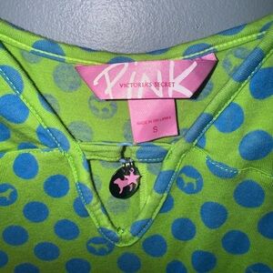 Features a bright lime green base with blue polka dots and iconic PINK dog logo print throughout. Spaghetti straps with a flattering V-neckline and adorable charm detail at the bust. Soft, stretchy fabric with a slight ruffle hem for that classic early-2000s vibe.