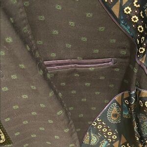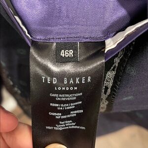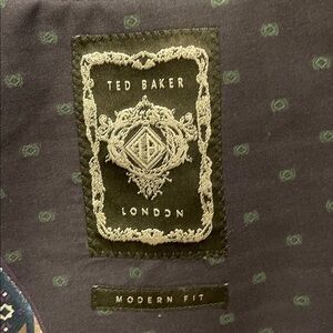 Features a two-button front closure, single back vent, and three-button cuffs. The fully lined interior showcases Ted Baker’s signature paisley and geometric print lining in rich teal, purple, and tan tones—an elevated detail that adds personality without sacrificing polish.