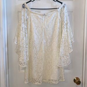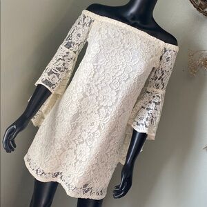 Chic off-shoulder angelic dress with intricate lace. Features flowing sleeves for added elegance.