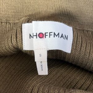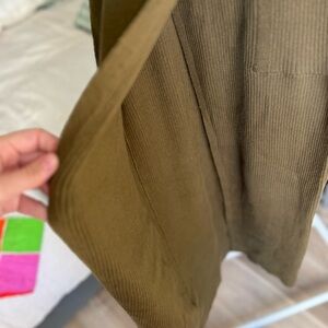 Elena fitted ribbed knit skirt in olive green. Overlap with slit at front. Side patch pockets. Elastic waistband.