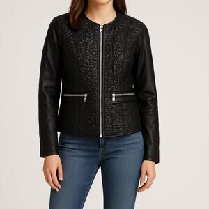 Baccini Black Vegan Leather Moto Jacket • Petite Medium • Edgy Zip Detail NWT