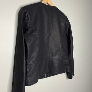 This sleek moto jacket blends edgy attitude with versatile street style. A black vegan leather outer, sharp zip accents, and slimming cut make it perfect for layering over dresses, tees, or jeans.