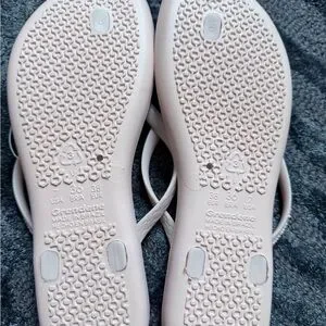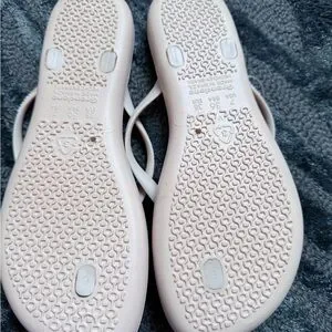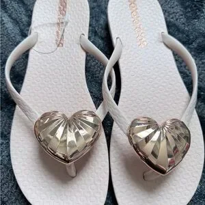 Stylish Ipanema sandals with heart detail. Somewhat a light peachy or pink color and gold accents. Perfect for casual wear.