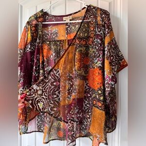ONE WORLD Multicolor Kimono Boho Rave Festival Flowy Blouse Tunic Drape Sleeve L