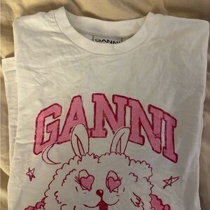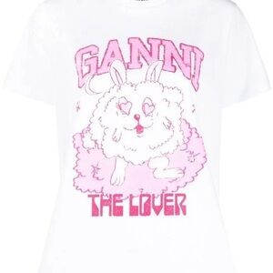 White short sleeve tee with pink graphic. Features playful design and Ganni logo.