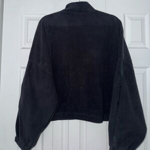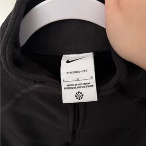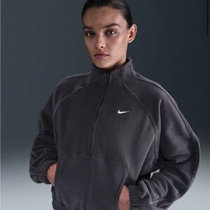 Nike Fleece 1/4 zip pullover in black. Made from 100% polyester. Features an oversized, cropped design. Hits at hips.