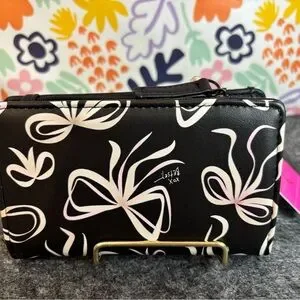 Betsey Johnson Coquette Bow Xokara zip-around wallet in black, pink, and cream with a bow print.