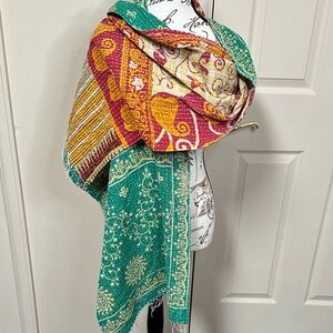 Vibrant reversible scarf with floral patterns. This is made from kantha which is recycled saris from India that are all handmade. They may show signs of imperfection and that’s part of the Kantha quality. They’re perfectly imperfect. Scarves are approx 17-19x75-85”