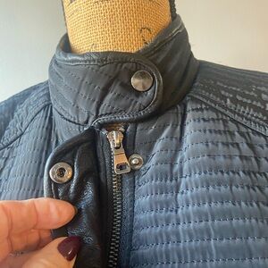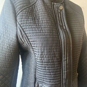 Stay stylish and warm with this elegant black quilted jacket. Features zip front closure with snaps at top and bottom., 2 zip front pockets, and quilted faux leather accents. Perfect for any occasion.its completely lined and great Preowned condition. Ships next business day.