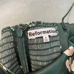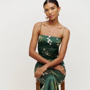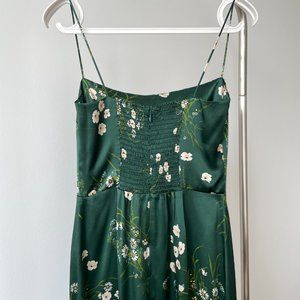 This is a slim fitting, ankle length dress with a straight neckline, spaghetti straps, and a center back slit. The smocked back bodice provides a little extra comfort. Length is designed to be worn with heels/hemmed to your liking. Elegant green design.