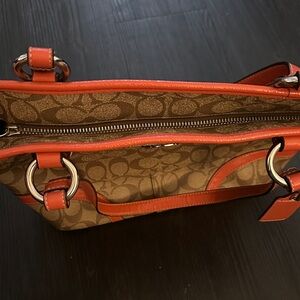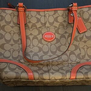 Stylish Coach tote with signature pattern. Tan body with bold orange trim. Perfect for daily use.