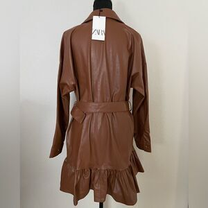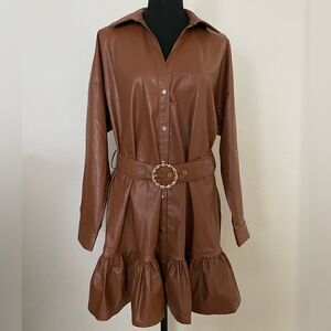 Faux leather mini dress with V-neck lapel collar and long sleeves. Flounced hem. Front gold snap button closure and self belt. Pit to pit approx 23” across, waist approx 21.5” and shoulder to hem approx 31” long. *Brand new with tags. Authentic brand