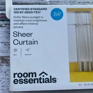 Set of 2 Room Essentials 84in. Rod Pocket Sheer Curtain panels in Gray NEW. Elegant sheer curtain by Room Essentials. Perfect for adding a touch of sophistication to any room. Comes in a versatile gray color.