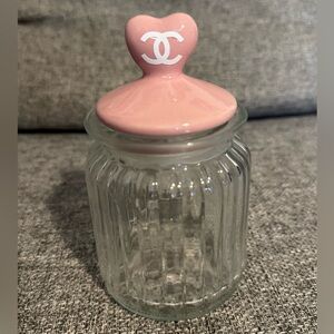 Chic glass jar with a pink heart lid and Chanel logo. Ideal for storing small items.