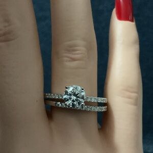 NWT. Size 9 wedding set in sterling silver. Set includes two pieces. Center large stone is four prong set in a band containing smaller stones part way around each side. The band is set with matching smaller stones part way around band. 1.41 CTW. Clarity:VVS color:D COLOR. Stamped inside with BS925M. Please be aware that Moissanite is not the same as lab grown diamond or natural diamond although it’s widely used as a diamond substitute. It is primarily lab grown and has a moths scale of 9.23 it is also NOT a CZ. Moissanite is known for its intense rainbow like fire and is doubly refractive