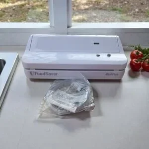 Compact white vacuum sealer by FoodSaver. Ideal for preserving food freshness.