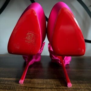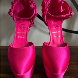 Elegant fuchsia satin heels with ankle strap. Signature red sole. Perfect for a bold statement. Worn for pictures only but never out. Clean bottoms. Very minimal marks. Size 37 1/2. No box. (From pet friendly home but kept away)