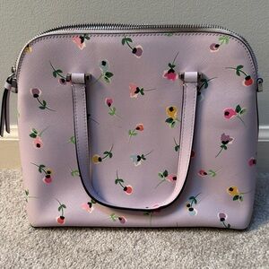 Elegant satchel with colorful floral pattern. Features dual handles and zip closure. Measurements are 11” long, 9” high and 5” wide.